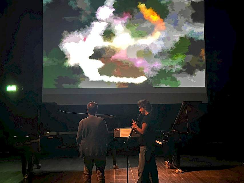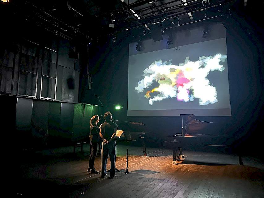 Ein Ritual, das aus der Begegnung von Gestik, Klang und Bild entsteht. In einem offenen und immersiven Raum hinterlassen alle Teilnehmenden Spuren auf einer gemeinsamen digitalen Leinwand: Zeichen, die sich auflösen, aber als Teil einer grösseren und umfassenderen Schöpfung weiterleben.